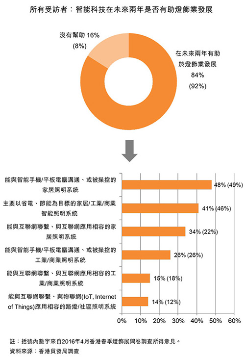 至于對未來發(fā)展的看法,大部分受訪者(84%)認(rèn)為智能科技在未來兩年將有助燈飾業(yè)的發(fā)展。受訪者認(rèn)為,智能燈飾最重要的發(fā)展領(lǐng)域包括:能與智能手機/平板電腦溝通、或被操控的家居照明系統(tǒng)(48%受訪者認(rèn)同);以及主要以省電、節(jié)能為目標(biāo)的家居/工業(yè)/商業(yè)樓宇智能照明系統(tǒng)(41%)。