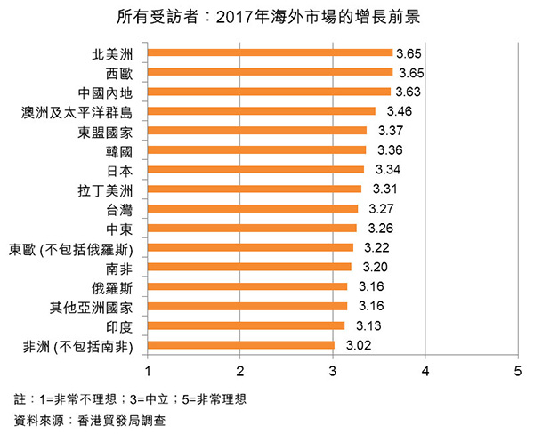 至于個別市場的增長前景,北美洲及西歐兩大傳統(tǒng)市場被視為2017年最具增長潛力的市場,兩者均獲得3.65分,亦較中國內(nèi)地的3.63分為高。緊隨其后的是澳洲及太平洋群島、東盟國家、韓國、日本和拉丁美洲。事實上,所有市場的得分都在中立水平的3分以上(評分由1至5),反映業(yè)界普遍對全球市場感到樂觀。